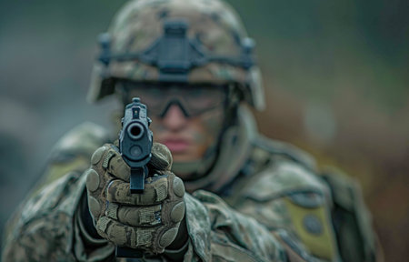 Armed military man takes aim, wearing full combat uniform and tactical equipment, representing defense, readiness, and focus.