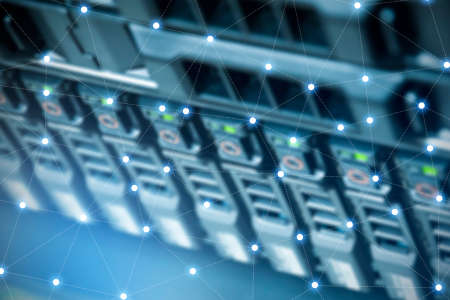 Connect dotted network with blurred server and storage in datacenter background, Technology, communication and business concept