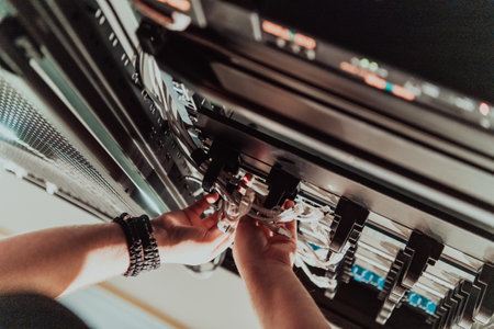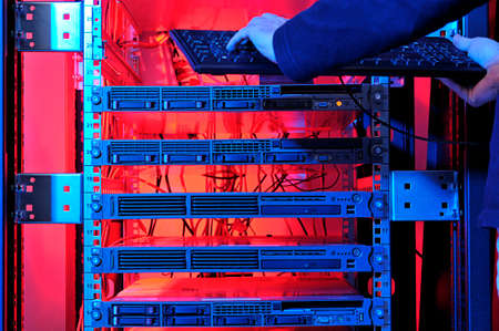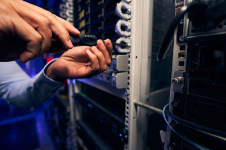 An Expert Engeneer in datacenter server room connecting cables in server cabinet in network server room.