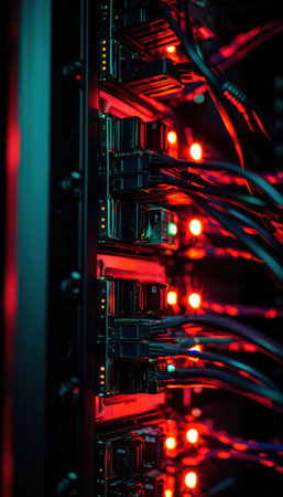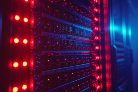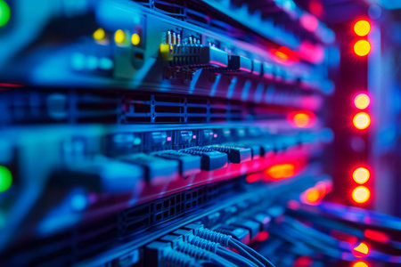 A close-up view of a data center server rack with vibrant red and blue LED lights, symbolizing network infrastructure and technology.