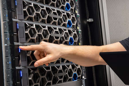 Hand Of Male Technical Consultant Examining Hardware In a Hyperconverged Datacenter Environment