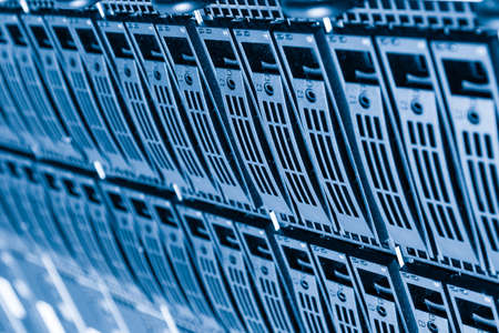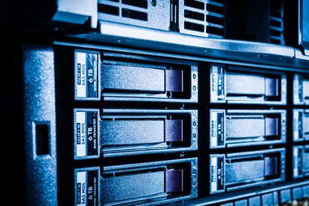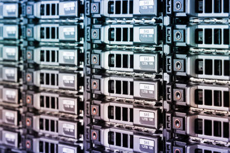 maintenance of hard drives inside data storage hosting center - open tray with cluster of hard disks waiting to be inspected