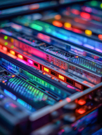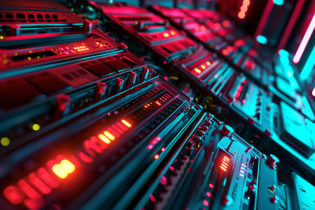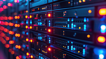 Sleek, high-tech server units glow with vivid led hues, creating an energetic, modern ambiance ideal for advanced digital infrastructure and cutting-edge innovation.