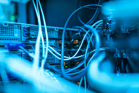 Server room in a modern office of a technology company. Development of a quantum computer. The concept of science, technology, big data and blockchain.