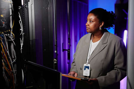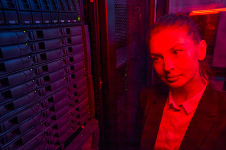 Waist up portrait of female system engineer setting up server network in neon light and using laptop, copy space