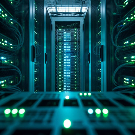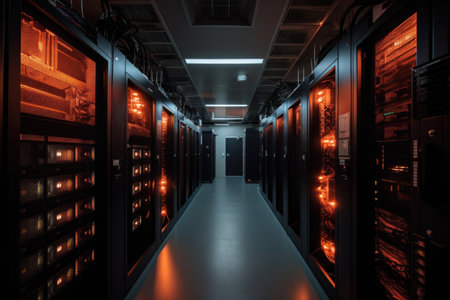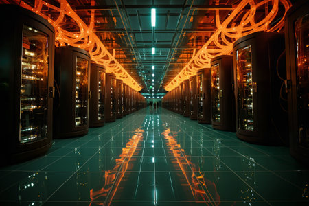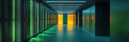 Rows of high-performance servers are lined up in a modern data center. Green lights illuminate the corridor, creating a vibrant and futuristic atmosphere in a secure environment during nighttime.