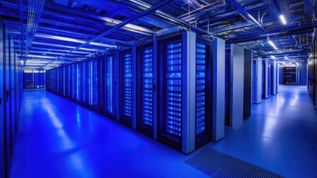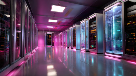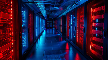 Explore the interior of a cutting-edge data center featuring rows of illuminated server racks, designed for optimal performance and data management in a high-tech environment.