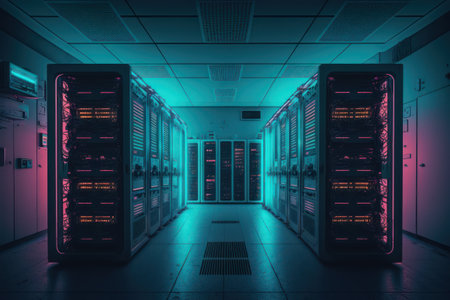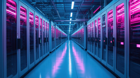 A stunning view of a futuristic data center featuring sleek server racks illuminated by vibrant neon lights, showcasing advanced technology in a modern environment.
