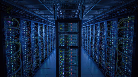 Rows of servers are presented in a dark, interior setting, suggesting a data center environment. The composition features a symmetrical perspective, with numerous interconnected cables and equipment. Blue and grey tones dominate the color palette, enhancing the modern and technological feel. This image is suitable for illustrating concepts of technology, data processing, and digital infrastructure.