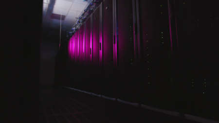Data Center With Multiple Rows of Fully Operational Server Racks. Modern Telecommunications, Cloud Computing, Artificial Intelligence, Database, Supercomputer Technology Concept.