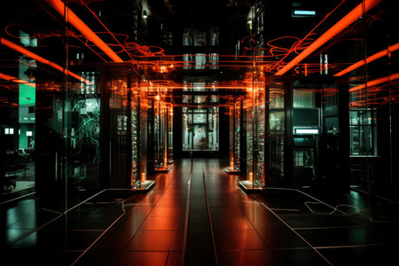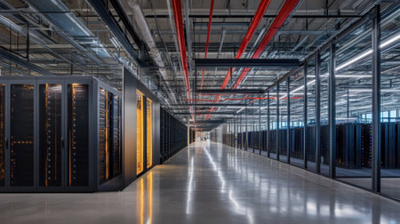 data center with emergency lights, generators, and fire suppression systems visible, created with generative ai