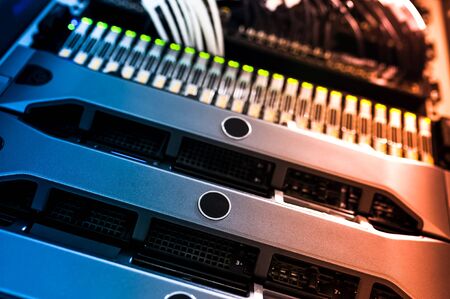 Working servers, switches or routers in data center with a lot of led lamps and cables