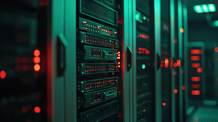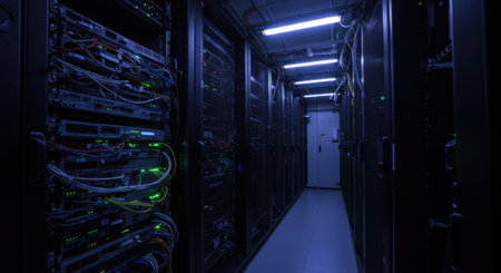 Server room blinking lights in data center with network cables, creating a futuristic technology background