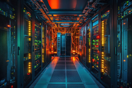 A high-tech data center features glowing server racks filled with colorful lights during nighttime hours.
