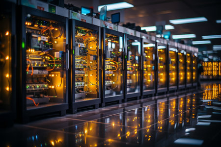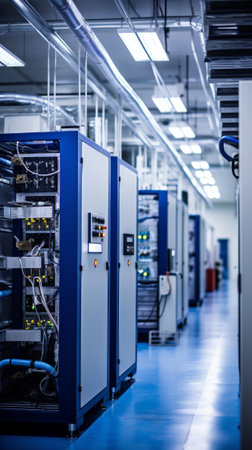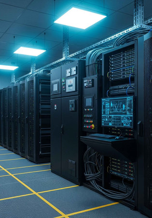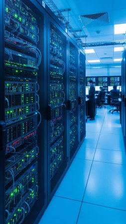 A modern data center with rows of server racks and high-tech equipment