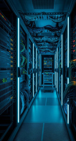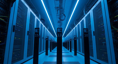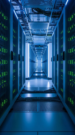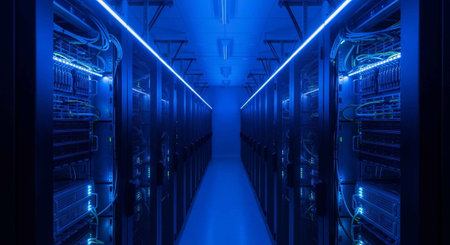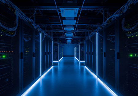A modern data center with rows of server racks illuminated by blue lights