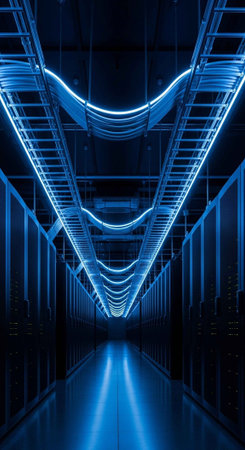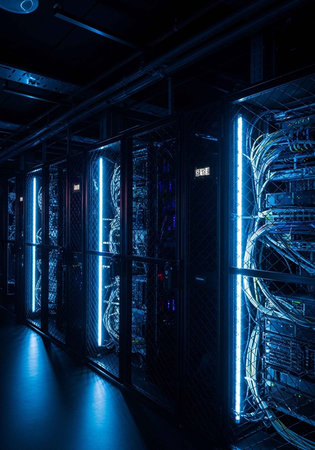 Rows of servers are presented in a dark, interior setting, suggesting a data center environment. The composition features a symmetrical perspective, with numerous interconnected cables and equipment. Blue and grey tones dominate the color palette, enhancing the modern and technological feel. This image is suitable for illustrating concepts of technology, data processing, and digital infrastructure.