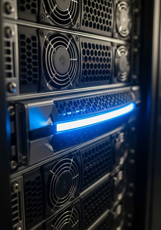 A close-up view of a server with blue lighting and ventilation fans