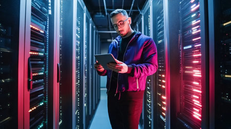 Data Center Engineer Monitoring Server Operations, Cybersecurity and Data Protection in Action