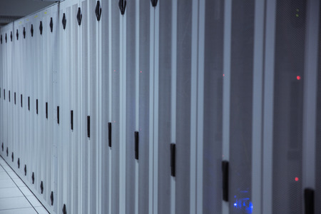 Server racks in internet data center. Backup, mining, hosting, mainframe, farm and computer rack with storage information.