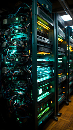 A detailed view of a server rack showcasing illuminated circuit boards and complex wiring, highlighting the technological sophistication of a modern data center environment.