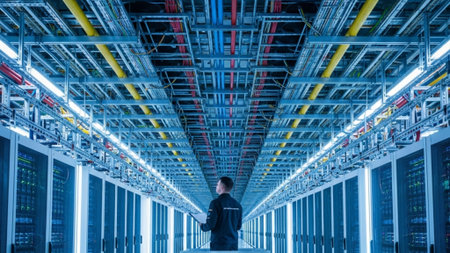 data center with floor-to-ceiling racks of servers and blinking lights, created with generative ai