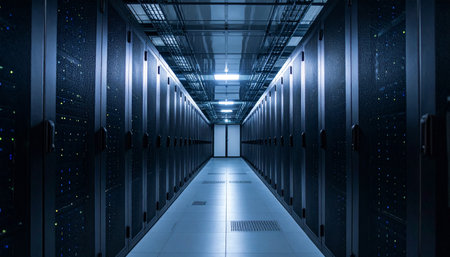 A view down a long, symmetrical corridor in a state-of-the-art data center. Rows of glowing server racks hum with processing power, illuminated by cool blue light.