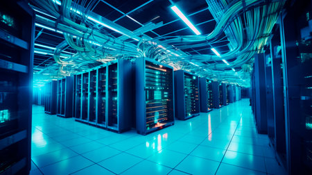 wide-angle view of a modern, high-tech data center, created with generative ai