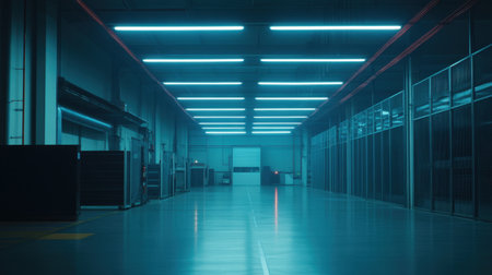 An expansive industrial warehouse interior featuring neon blue lights, creating a futuristic ambiance. The space is minimal and unoccupied, showcasing modern architectural elements.