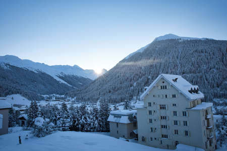 Beautiful sunrise after heavy snowfall in the Swiss Mountains Alps at Davos