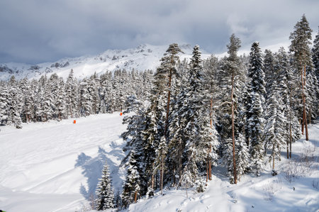 Beautiful landscape of the Arkhyz ski resort with mountains, snow and forest on a sunny winter day. Caucasus Mountains, Russia.