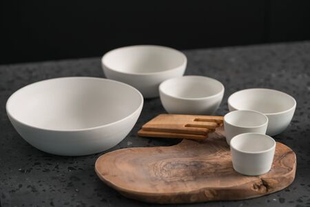 Empty matt white ceramic handmade tableware set on concrete countertop, shallow focus