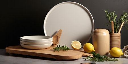 Set of kitchen ceramic tableware and wooden cutting boards on a table. Eco style home still life. : Generative AI