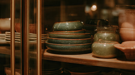 This image features an exquisite arrangement of ceramic tableware displayed in a wooden cabinet, showcasing rich textures and warm tones. The soft lighting enhances the beauty of the handcrafted pieces, inviting a cozy yet modern atmosphere.