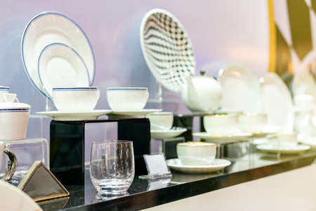 Ceramic or porcelain tableware on wooden pedestal on store shelf. Ceramic texture