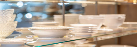 Elegant Display of Stacked Ceramic Bowls Showcasing Modern Tableware Design and Patterns. Concept of Contemporary Home Decor, Elegant Dining, Stylish Table Settings, Interior Design. Banner.