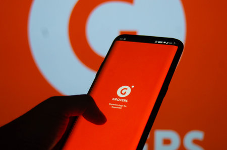 Jaipur, India, Circa 2020 - Photograph of the mobile application for the groceries application Grofers. The background also has a board with grofers mentioned on it