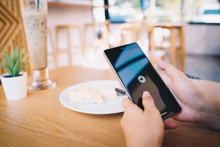 Food photography woman hands make photo cake with smartphone / taking photo food for post and share on social networks with camera smart phone in restaurant