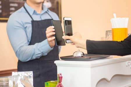 Close-up female hand using smartphone taking a cup of coffee for Post upload file to online on Internet .