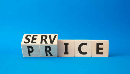 Service and price symbol. Turned wooden cubes with words service and price. Beautiful blue background. Business and service and price concept. Copy space