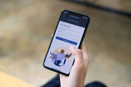 BANGKOK, THAILAND - MAY 17, 2020: A user opens the Microsoft Teams application on smartphone screen on the wooden desk. Microsoft Teams is a popular application suitable for working from home.