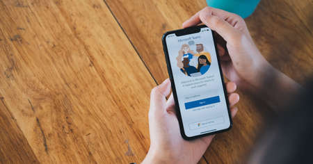 CHIANG MAI, THAILAND - JAN 17 2021 : A working from home employee is downloading the Microsoft Teams social platform, ready for remote working in isolation from home