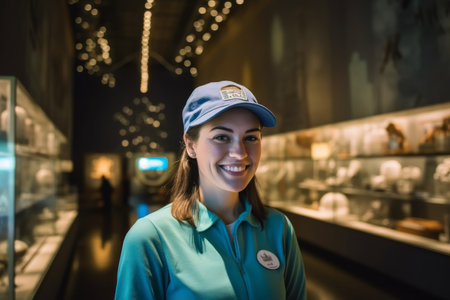 Portrait of a beautiful young woman in a turquoise T-shirt and cap looking at the camera and smiling while standing in front of a shop window