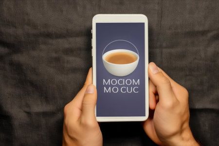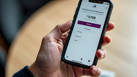 A person is using a mobile app to confirm their order, sitting in a contemporary workspace with greenery and a coffee cup nearby, enjoying the process.