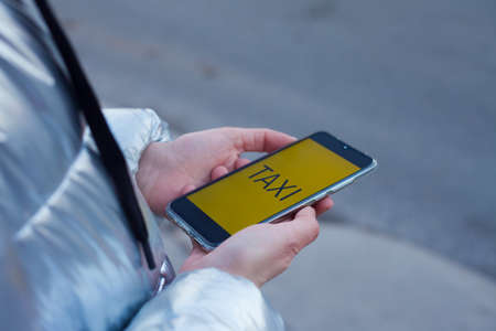 Call a taxi using a mobile app, a young woman standing by the road and waiting for a car. Smartphone in hand close up