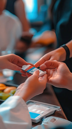 Individuals monitor their blood glucose levels at a café, surrounded by others, while engaging in daily activities in a lively environment, showing health management in public spaces.