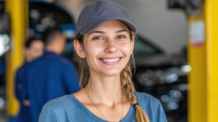 Portrait of a smiling female mechanic standing at the car service station