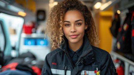 A poised female responder in uniform and glasses gazes intently outdoors, illuminated by the vibrant glow of ambulance siren lights blending into the night sky.