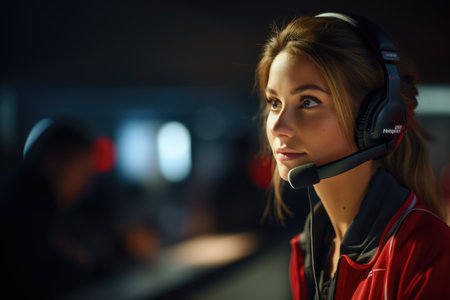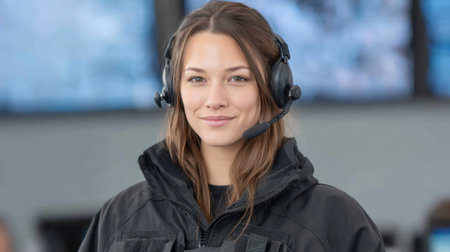 A confident young woman wearing a headset stands in a control room, showcasing focus and professionalism in a modern technological environment, embodying effective communication and teamwork.