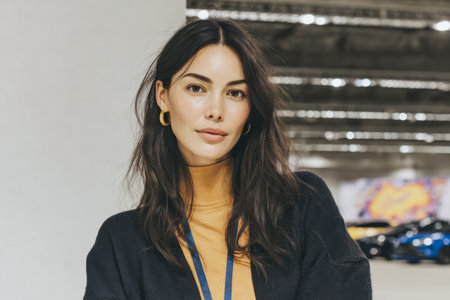 Woman stands in an indoor event space with bright lights and colorful cars behind her. She has dark hair and wears simple clothing. The atmosphere is lively and vibrant.